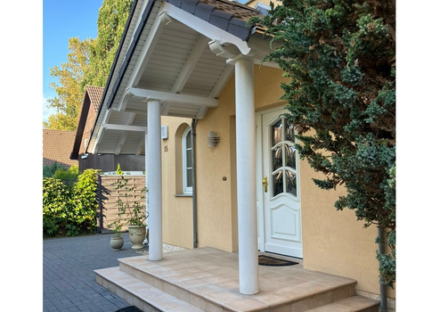 Der überdachte 6m lange Balkon mit zwei Säulen schafft eine perfekte Verbindung zwischen Innen- und Außenraum: