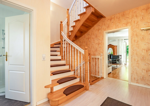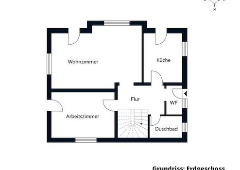 Das Haus besticht durch seine durchdachte Raumkonzeption: Ein großzügiger überdachter Eingangsbereich mit klassischen Säulen empfängt Sie, gefolgt von einem hellem Flurbereich mit eleganter Holztreppe. Im Erdgeschoss finden Sie zwei lichtdurchflutete Zimmer mit erhöhter Deckenhöhe, eine modernen Landhausküche und einem Gästebad. Alle Fenster und Außentüren des Erdgeschoss und Obergeschoss sind mit charakteristischen Stichbögen gestaltet, die dem Haus seinen besonderen architektonischen Charme verleihen.