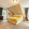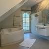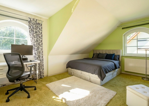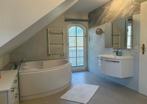 Das Obergeschoss beherbergt zwei komfortable Schlafzimmer und zwei renovierte Bäder, wobei ein exklusives Badezimmer mit Marmoroptik nur vom Elternschlafzimmer zugänglich ist. Von hier aus können Sie auf den Balkon gelangen und Ihren privaten Rückzugsort mit Blick auf den blühenden Garten und den dahinter liegenden grünen Wald genießen.