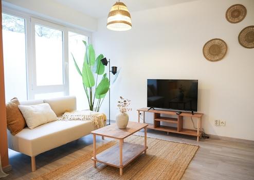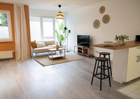 🛋️ Wohnbereich mit Sofa, Smart-TV und schnellem WLAN
