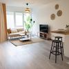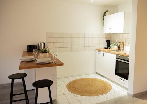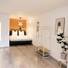 Das Apartment bietet Platz für zwei Personen und verfügt über eine offene Wohnküche, ein modernes Bad und eine gemütliche Schlafnische.
