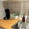 🍳 Voll ausgestattete Küche mit Herd, Backofen, Kühlschrank, Kaffeemaschine und Geschirr