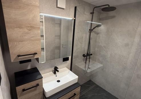 Moderne Einbauküche mit hochwertigen Küchengeräten sowie ein stilvoll gestaltetes, modernes Badezimmer. Die hochwertige und zeitgemäße Ausstattung unterstreicht den gehobenen Wohnkomfort der Wohnung.