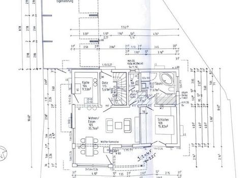 Durch 153m² Wohnfläche und 242m² Nutzfläche ist viel Raum für Wohnen, Hobby und vieles mehr vorhanden. Ein zusätzliches Zimmer ist durch Umwandlung der Küche im OG oder Auftrennung des großen Zimmers im OG denkbar. Drei Seiten des Hauses sind von Garten umgeben.