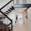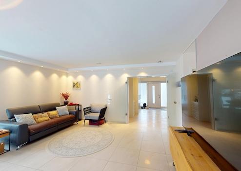 Im Obergeschoss führt eine offene Treppe zu einer Galerie sowie zwei großzügigen Schlafzimmern, jeweils mit En-Suite-Bad. Das Hauptschlafzimmer verfügt über Ankleide, ebenerdige Dusche und Eckbadewanne. Beide Zimmer bieten Zugang zum Balkon mit Blick in den Garten.