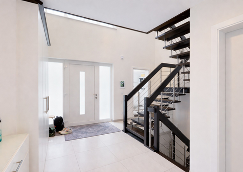Im Erdgeschoss empfängt ein großzügiger Eingangsbereich mit Garderobe. Der Wohn- und Essbereich mit Kamin, bodentiefen Fenstern nach Süden und Osten sowie großer Glasfront ist hell und offen gestaltet. Die halboffene Küche ist hochwertig ausgestattet, unter anderem mit integriertem Kaffeevollautomaten, Weinkühlschrank sowie eingebauten Geräten. Ergänzt wird die Ebene durch ein Gäste-WC mit ebenerdiger Dusche, Hauswirtschaftsraum, ein zusätzliches Gästezimmer sowie ein ca. 25 m² großes Büro. Durch die Kombination aus Arbeitszimmer, Duschbad und möglicher Küchenzeile lässt sich mit überschaubarem Aufwand eine separate Einheit mit eigenem Zugang schaffen.