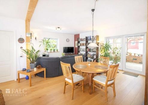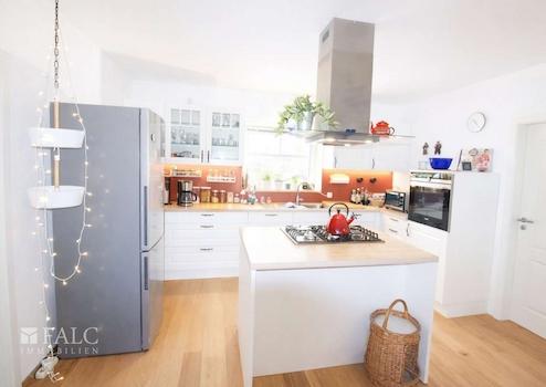 Der großzügige Wohn- und Essbereich bildet das Herzstück des Hauses. Die offene Küche ist modern gestaltet und mit hochwertigen Markengeräten ausgestattet. Aktuell verfügt sie über ein Gaskochfeld, welches bei Bedarf problemlos ausgetauscht werden kann.