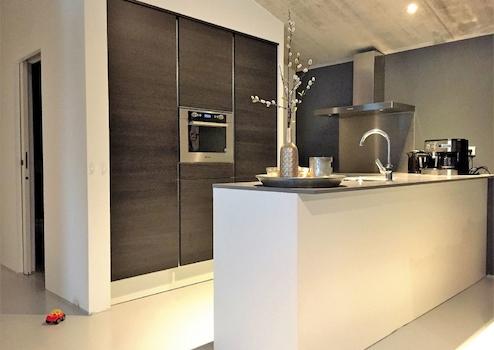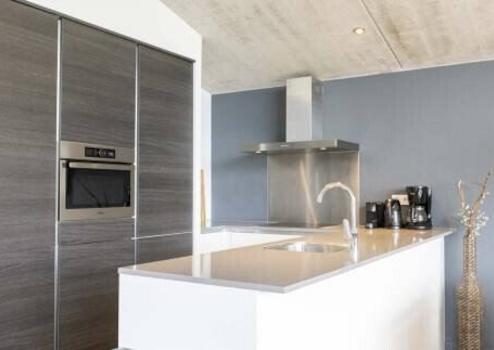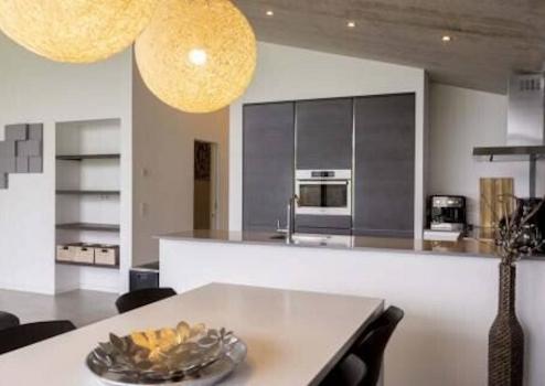 Im Essbereich finden Sie einen großen Esstisch sowie die grifflose Designküche mit Insel und allen Standard-Einbaugeräten (Geschirrspüler, Mikrowelle, Kühlschrank mit Gefrierfach, Induktionskochfeld) der Marke Bauknecht. Außerdem sind eine Kaffeemaschine, ein Wasserkocher und ein Toaster vorhanden.