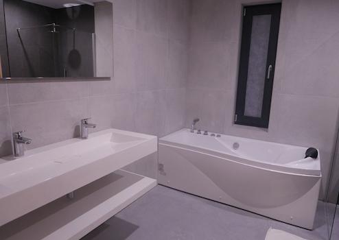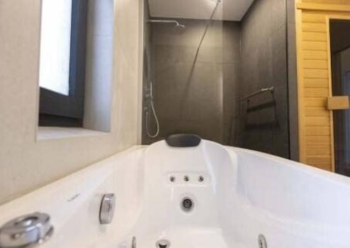 Das große, sehr geräumige Badezimmer verfügt über eine Whirlpool-Badewanne, eine bodengleiche Dusche, eine Infrarot-Sauna und ein breites Waschbecken mit zwei Armaturen.