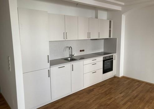 Die im Inserat gezeigten Bilder stellen die Wohnung teilweise im noch unrenovierten Zustand dar. Der Einbau der neuen Küche ist für Kalenderwoche 13 vorgesehen; das abgebildete Küchenfoto stammt aus der darunterliegenden Wohnung im 1. Obergeschoss und dient als Referenz für die Ausstattung.