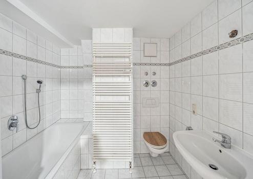 Das Badezimmer ist mit Badewanne und separater Dusche ausgestattet. Sämtliche Sanitärobjekte – darunter WC und Waschbecken – wurden im Zuge der Renovierung erneuert und präsentieren sich zeitgemäß und stilvoll.