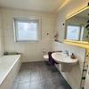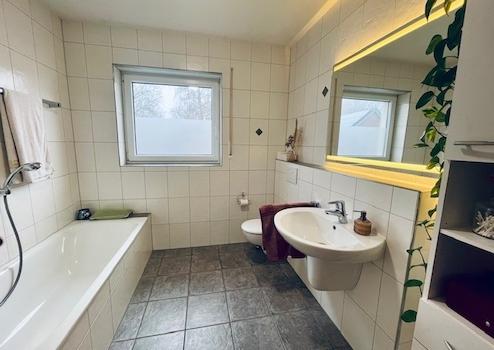 Badezimmer mit Dusche, Badewanne, Waschtisch, WC und Fenster