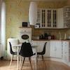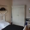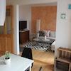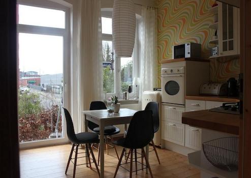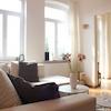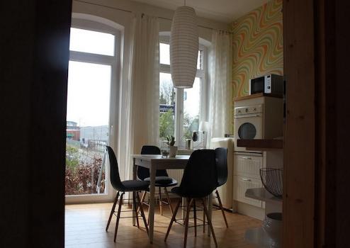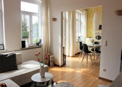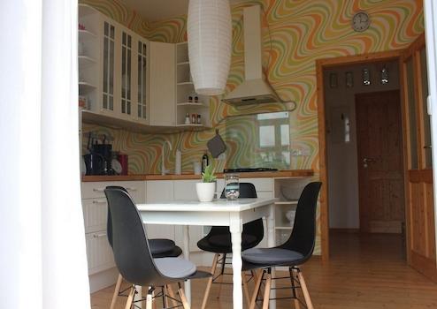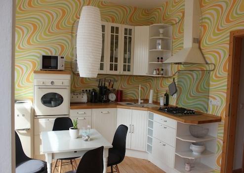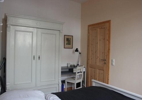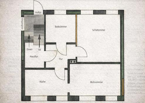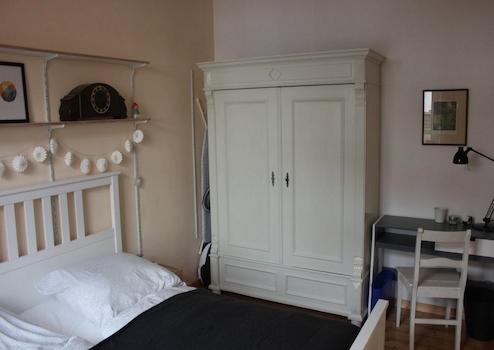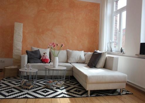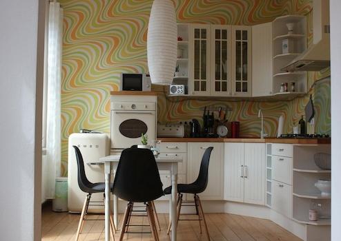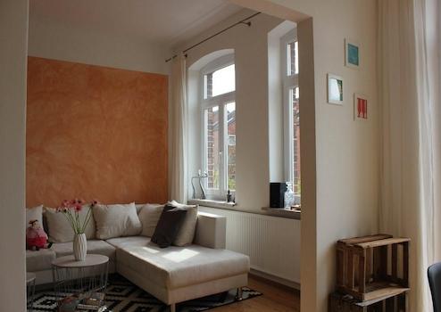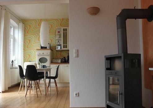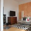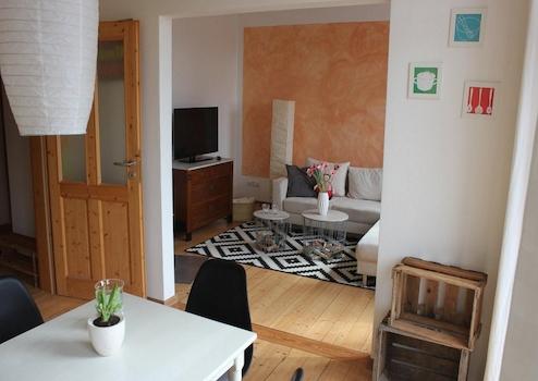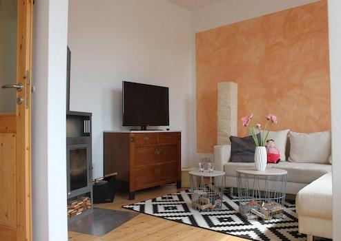 Das Wohnzimmer ist gemütlich geschnitten, der Altbaucharme wird durch aufgearbeitete Holzböden und gestaltete Wände (Retrotapeten, Wischtechnik, Wandlampen) unterstrichen. Das Schlafzimmer bietet ein Doppelbett sowie ausreichend Stauraum in einem Kleiderschrank und ist ideal für eine Einzelperson oder ein Paar.