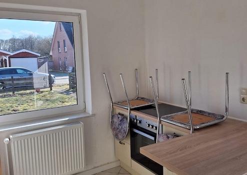 Die Küche ist gebraucht, aber hochwertig. Sie verfügt über 3 Plätze an einem Hochtisch.