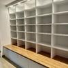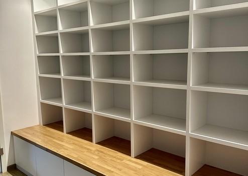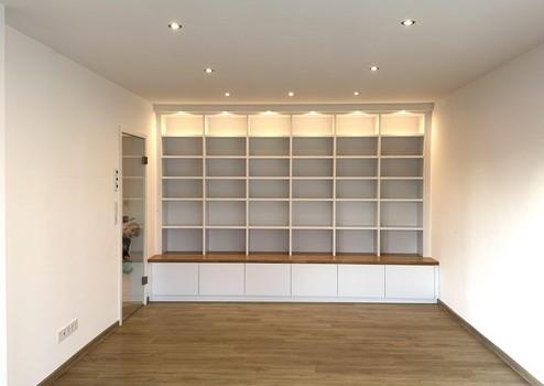 Im Wohnzimmer ist zudem ein maßgefertigtes hochwertiges Bücherregal inkl. Beleuchtung verbaut.