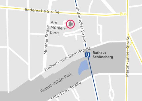 Wohnen unter der Freiheitsglocke. Die Am Mühlenberg liegt direkt am Rathaus Schöneberg. In unmittelbarer Nähe befindet sich der Volkspark mit vielen Sportmöglichkeiten und dem Fennsee für erholsame Spaziergänge im Grünen. Zweimal in der Woche findet ein großer Wochenmarkt am Rathaus statt, der zum Bummeln und Shoppen einlädt.