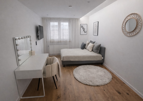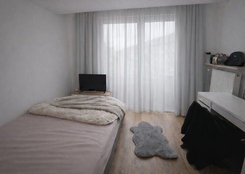 Das Zimmer und die Wohnung ist vollständig möbliert mit Bett und Matratze, großem Kleiderschrank sowie Schreibtisch und Stuhl und eignet sich ideal für Berufstätige oder Pendler.