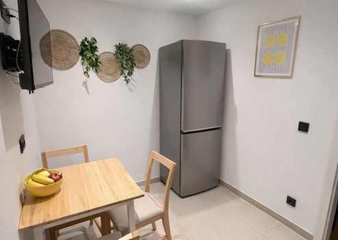 Küche mit Essbereich und TV sowie das Badezimmer mit Dusche und WC werden gemeinschaftlich genutzt. Die moderne Einbauküche ist voll ausgestattet, inklusive Spülmaschine und Kühlschrank. Eine Waschmaschine steht ebenfalls zur Verfügung.
