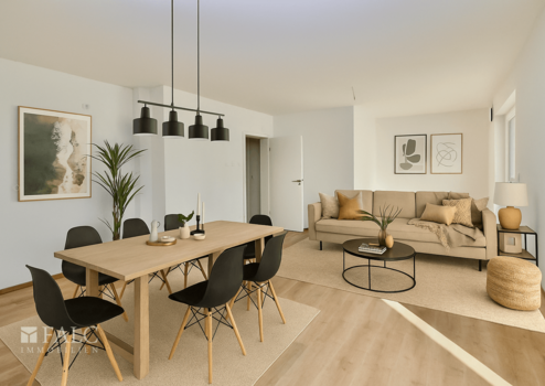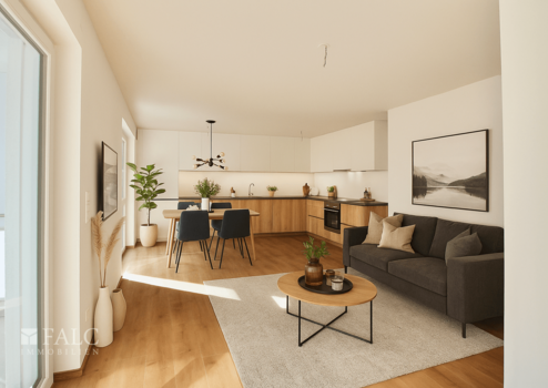 Die Wohnung bietet einen großzügigen Wohn- und Essbereich mit offener Küche, ein komfortables Schlafzimmer sowie ein Badezimmer mit praktischem Waschmaschinenanschluss. Die teilüberdachte Terrasse und ein kleiner Garten runden diese Wohnung ab.