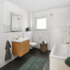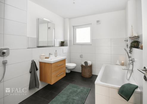 Die Wohnung ist hochwertig ausgestattet: dreifach verglaste Kunststofffenster mit elektrischen Rollläden, Fußbodenheizung und ansprechende Bodenbeläge aus Laminat und Fliesen-Steinzeug.