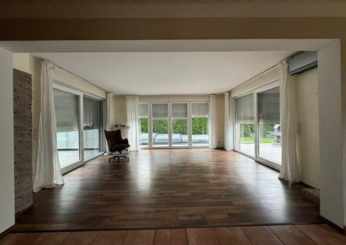 Das fast 70 Quadratmeter große Wohnzimmer ist ein Highlight des Hauses: Mit seinen zwei Schiebeelementen und einer Doppeltür bietet es direkten Zugang zum Garten. Von hier gelangen Sie entweder in den Wintergarten, auf die Grillterrasse oder direkt zum Swim & Fun-Pool. Ein Kaminschornstein ist bereits vorgerüstet.