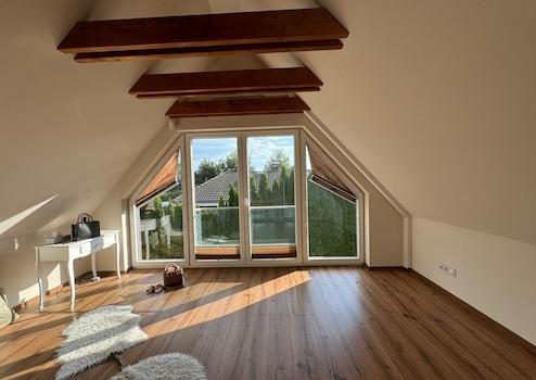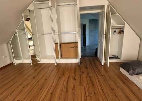 Das Schlafzimmer ist ein Ort der Ruhe und Eleganz. Es verfügt über einen maßangefertigten Einbauschrank, der sich harmonisch bis in den First einfügt, und schafft so ein stilvolles Ambiente. Die moderne Einbauküche – ausgestattet mit hochwertigen Geräten wie Herd, Ofen, Geschirrspülvollautomat, Kühlkombi und Radio – steht zur kostenfreien Übernahme bereit und macht die Küche zum Herzstück des Hauses. Eine integrierte Wassereinigungsanlage sorgt zudem für höchsten Komfort und reine Qualität.
