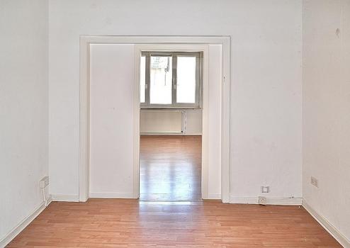 Die größere Wohnung mit ca. 63m2 im Erdgeschoss des Dreifamilienhauses bietet ein Wohnzimmer, ein Schlafzimmer, eine ca. 12m² große Küche, ein Büro, ein Duschbad, eine Diele und einen Windfang.