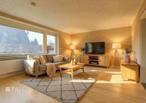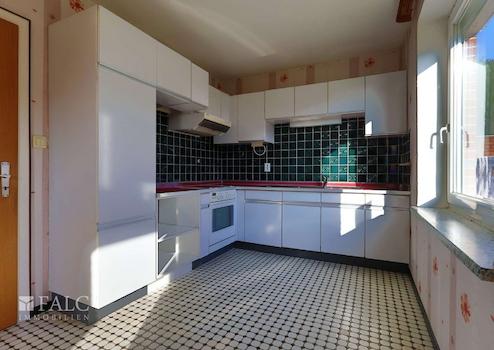 Der Wohnbereich ist großzügig geschnitten und wird durch große Fensterflächen angenehm belichtet. Die Küche ist separat gehalten und bietet eine klassische, funktionale Grundlage für Ihre individuelle Gestaltung.