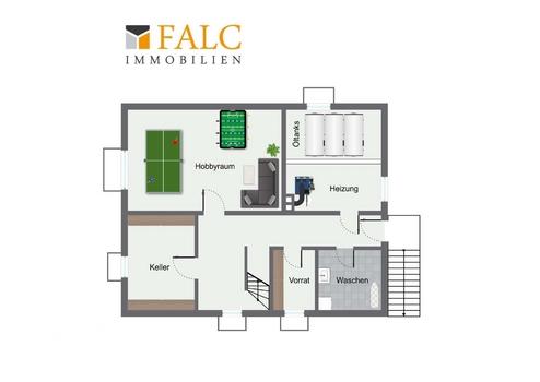 Auch die Raumaufteilung im Keller zeigt sich durchdacht. Neben einem Abstellraum befindet sich ein beheizter Hobbyraum, in dem sich abseits der privaten Wohnbereiche feiern lässt. Ergänzt werden diese beiden Räume durch eine Vorratskammer und eine Waschküche, sowie dem Heizungsraum mit abgetrenntem Bereich für die Öltanks. Über eine Aussentreppe gelangen Sie direkt in den Garten.
