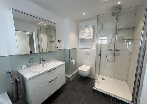 Im Erdgeschoss befindet sich ein neu gestaltetes Gästebad, während im Obergeschoss ein ebenfalls neues, voll ausgestattetes Badezimmer, inklusive Dusche und Badewanne, höchsten Komfort bietet. Beide Bäder sind zeitgemäß, hochwertig ausgestattet und fügen sich harmonisch in das Gesamtbild des Hauses ein.