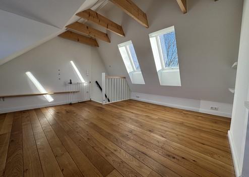 Ein besonderer Blickfang ist der neue Kamin, der dem Wohnbereich nicht nur wohlige Wärme, sondern auch eine exklusive Wohnatmosphäre verleiht. Das Wohnzimmer mit hohen Decken und frei liegenden Deckenbalken unterstreicht den großzügigen Charakter des Hauses und schafft ein offenes, lichtdurchflutetes Raumgefühl.