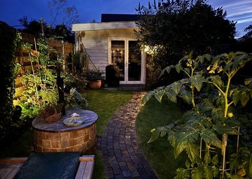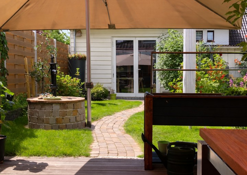 Der Garten ist mit viel Liebe gestaltet und bietet neben Erholungsflächen auch Obstpflanzen, die das naturnahe Wohnen unterstreichen.