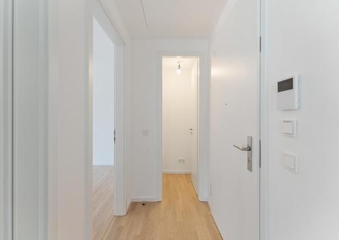 Die Wohnung verfügt über eine hochwertige Einbauküche mit Backofen, Kühlschrank, Geschirrspüler und Ceranfeld und ist nicht möbliert. Der gesamte Fußboden ist mit hochwertigem Parkett, die Bäder sind mit Feinsteinzeug und die bodentiefen Terrassentüren/Fenster sind mit Sonnenschutzrollos, das Duschbad ist mit hochwertigen Markengeräten ausgestattet. Der moderne Neubau bietet auch eine Videogegensprechanlage. Die Wohnung wird durch eine Fußbodenheizung erwärmt, welche für ein angenehmes Raumklima sorgt. Fahrräder können in den großzügigen Fahrradkellern im Untergeschoss abgestellt werden.