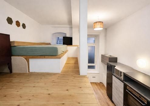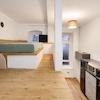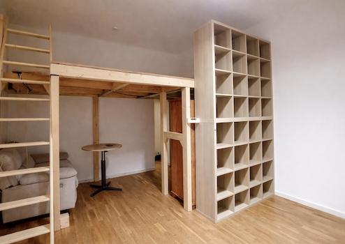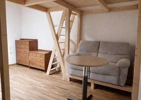 Auch der zweite Raum bietet durch seine zusätzliche Ebene deutlich mehr nutzbare Fläche. Hier findet selbst ein 1,80 x 2,00 m Bett komfortabel Platz, während darunter Raum für Wohnen, Arbeiten oder Essen bleibt.