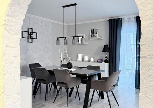 Erdgeschoss: Großzügiges Wohn- und Esszimmer mit Zugang zur überdachten Terrasse. Die moderne Einbauküche (mit Induktion & Hochbackofen) bietet Platz für eine 4-Personen-Sitzgruppe.