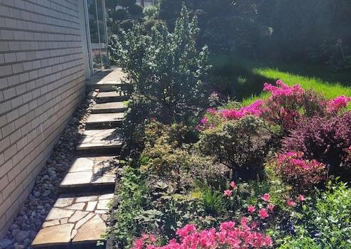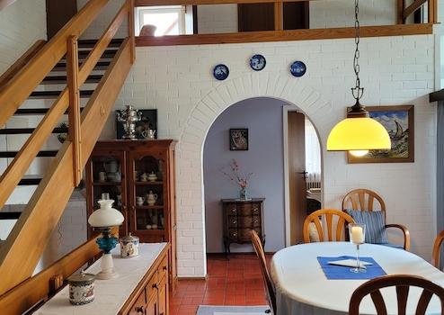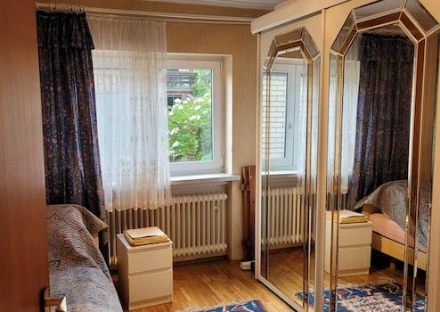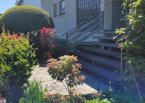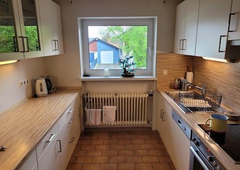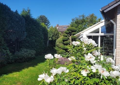 Das geklinkerte, möblierte Einfamilienhaus ist individuell zugeschnitten und besticht durch seine zweckmäßige Aufteilung. Hinter der Haustür können Sie Ihre Gäste in einem kleinem Foyer begrüßen, bevor man in den in einer etwa 5 m hohen Aula mit Galerie befindlichen Ess-/Wohnbereich eintritt. Von diesem aus ist direkt die komplett mit Markenprodukten (Herd, Abzugshaube, Spüle, Spülmaschine, Kühl-/gefriereinheit) ausgestattete Küche zu erreichen. Ferner gelangt man von der Aula in das eigentliche Wohnzimmer mit gemeinsamer Verbindung zum nach Süden gerichteten, durch elektrische Markise zu beschattenden Wintergarten und zu einem kleinen Flur, an dem zwei Schlafzimmer, Badezimmer u.a. mit Badewanne und dem Gäste-WC liegen. Alles auf einer Ebene, so auch der Zutritt aus dem Wintergarten zum südlich gelegenen, herrlich bepflanzten und vollständig umfriedeten Garten. In einem Gartenhäuschen werden alle Geräte und Werkzeuge geschützt vor Witterung ordentlich untergebracht. Vom Garten aus ist auch die Garage uneinsehbar zu erreichen, vor der sich genügend Platz für einen weiteren PKW findet. Im Keller befinden sich neben dem Heizungskeller mit Zugang über eine Außentreppe zum Garten ein geschlossener Vorratskeller sowie zwei weitere Tageslichträume, von denen einer sogar über eine Kammer mit Handwaschbecken und WC verfügt. Hier könnten Sie bequem Ihre Gäste übernachten lassen oder ungezügelt Ihren Hobbys. Im zweiten Stock, es handelt sich um das ausgebaute Dachgeschoss, befinden sich ein kleines, bspw. als Büro nutzbares Zimmer und ein großes Zimmer, welches leicht zu zwei Zimmern getrennt werden könnte, da zwei Zimmertüren eingebaut sind. Insgesamt können Sie mit Ihrer Familie in diesem gemütlichen, ausreichend Platz bietenden Anwesen schon bald den Frühling und Sommer genießen.