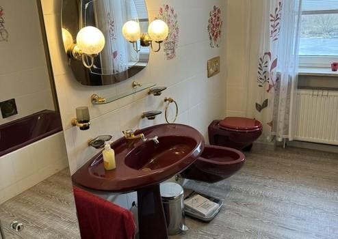 Im 1.OG befinden sich ein Gäste WC und ein Badezimmer mit Dusche und Badewanne. In dem Bad ist auch die erst 1,5 Jahre alte Gasheizung. Dann befinden sich im 1.OG 3 Schlafzimmer, ein sehr großes Ankleidezimmer, sowie ein Büro und ein Kaminofen.