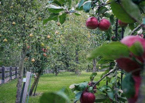 Eine Streuobstwiese mit Aprikosen-, Apfel-, Pfirsich-, Kirsch-, Pflaumen-, Quitten- und Maulbeerbäumen verleiht dem Gelände besonderen Charme. Ergänzt wird die grüne Umgebung durch eine alte Eiche, Kastanie und einen Walnussbaum, die über den gepflegten Wiesen Schatten spenden. Ein natürlicher Teich rundet die harmonische Atmosphäre ab.