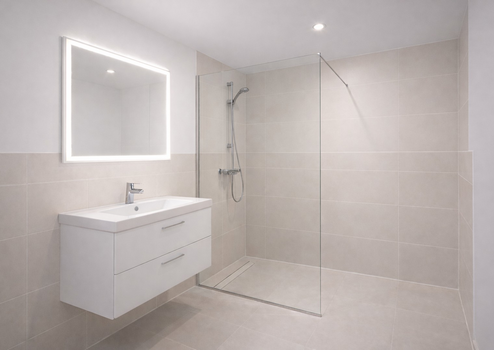 - Hochwertige Sanitärgegenstände und zeitlose Feinsteinfliesen (60x60)