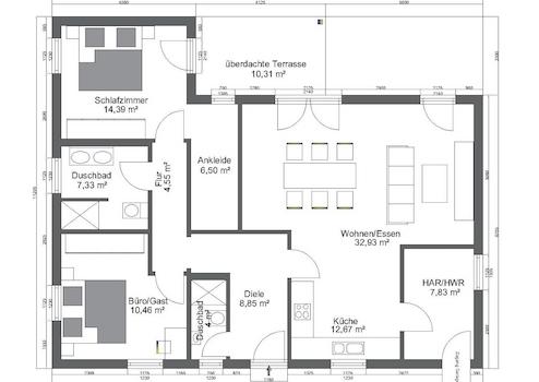 Der Bungalow ist konzipiert für Paare und Singles. Neben einem großzügigen Wohn-/Ess- und Kochbereich bietet der Grundriss eine perfekte Raumaufteilung und einen zusätzlichen Raum, der als Home-Office, Gäste-/Hobbyraum genutzt werden kann. Der Bungalow ist barrierearm geplant und bietet größtmöglichen Wohnkomfort auf einer Ebene. Die Garage ist mit einem praktischen Nebeneingang in den Hauswirtschafts-/Haustechnikraum geplant.