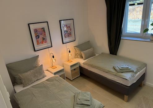 Die Wohnung verfügt über ein gemütliches Schlafzimmer, das flexibel mit zwei Einzelbetten oder einem Doppelbett genutzt werden kann. Das helle Wohnzimmer lädt zum Entspannen ein und bietet zusätzlich ein ausziehbares Schlafsofa, das Platz für bis zu zwei weitere Personen bietet. Somit eignet sich die Wohnung ideal für Paare, Geschäftsreisende oder kleine Familien.