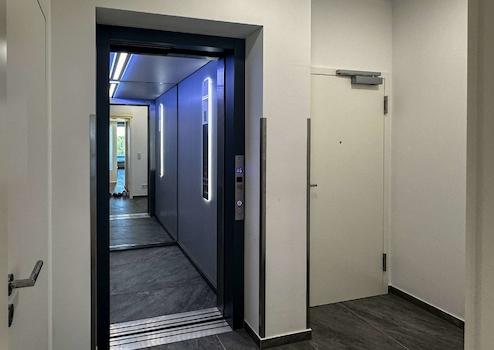 Ein Personenaufzug ermöglicht den direkten Zugang vom Kellergeschoss bis hinauf zur Penthouse-Wohnung. Der großzügige Eingangsbereich empfängt Sie freundlich und bietet ausreichend Platz für eine Garderobe.