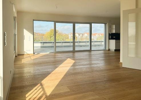 Das herrlich große und moderne Wohnzimmer mit offener Küche stellt das Herzstück dar. Bodentiefe Fenster und der hochwertige, in der kompletten Wohnung ausgelegte Parkettboden, schaffen eine edle Atmosphäre in den Räumlichkeiten. Im Wohnzimmer befindet sich ein Kaminanschluss. Von hier gelangen Sie auf das Highlight der Wohnung: die beeindruckende Dachterrasse mit einer Nutzfläche von ca. 34 m². Die Terrasse besticht nicht nur durch die prächtige Größe, sondern auch durch die Panoramafront.