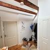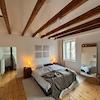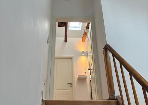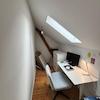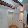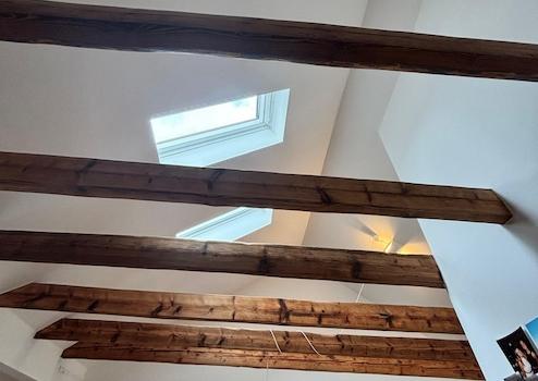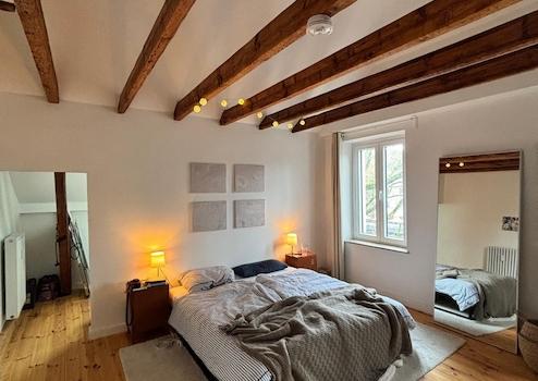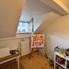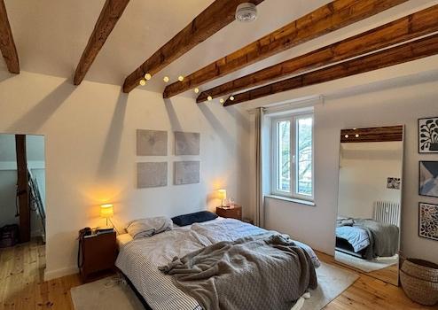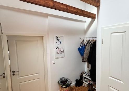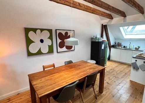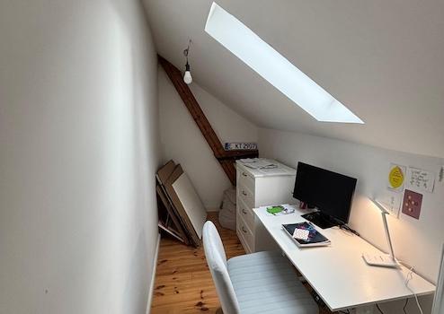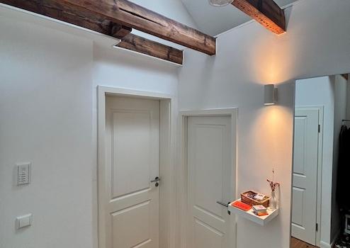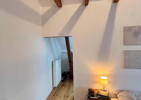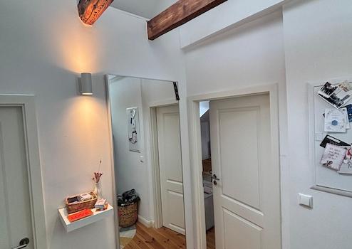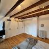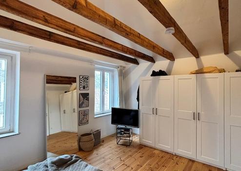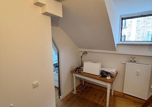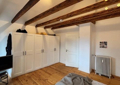 Dachgeschosswohnung mit offenem Spitzboden und freiliegenden Balken, neue Holzdielen. Zusätzlich eingebaute Dachflächenfenster sorgen für viel Licht.