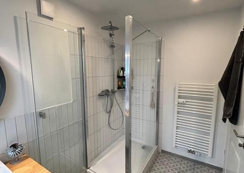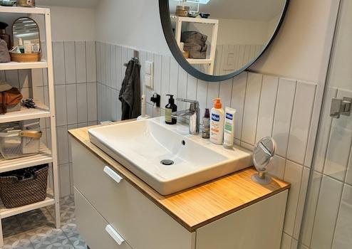 Schlafzimmer mit angrenzender kleiner Kammer (zum Beispiel für einen begehbaren Kleiderschrank), ein weiteres Zimmer mit kleiner Kammer, ein neues Badezimmer mit Fenster und Lüftung, kleine Diele, großer offener Koch-Wohn-Essbreich. Die Einbauküche kann von den Vormietern nach Absprache erworben werden.