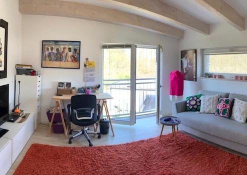 - keine Dachschrägen durch Pultdach, sichtbare Holzdeckenbalken, Raumhöhe bis 3,5 m