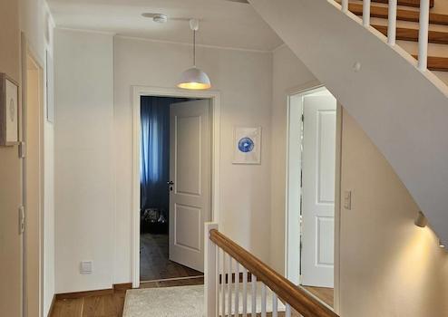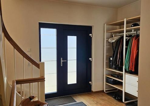 Nachdem Sie Ihr Fahrzeug auf einem der 3-4 Stellplätze vor dem Haus geparkt haben, betreten Sie die Immobilie über den großzügigen Dielenbereich mit offenem Treppenhaus und Garderobe. Auf dieser Etage befindet sich links das Gästebadezimmer mit WC; Waschbecken und Dusche. Das Zimmer daneben kann als Büro, Gästezimmer oder auch Schlaf- oder Kinderzimmer genutzt werden. Rechts eröffnet sich dann das größzügige Wohn- Esszimmer mit offener Küche. Die derzeit vorhandene Einbauküche verbleibt im Haus und kann von den neuen Mietern genutzt werden. Dieser Raum besticht mit seiner Größe, offenen Bauweise und durch die großen, bodentiefen Fenster (mit Zugang zum Wintergarten) auch mit Helligkeit.