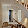 Über die hochwertige, offene Holztreppe gelangen Sie ins 1. Obergeschoss. Dort befindet sich rechts - baugleich zum Wohnzimmer darunter- ein großzügiges (Schlaf-)Zimmer mit Galeriebalkon (mit Blick in den darunter liegenden Wintergarten).