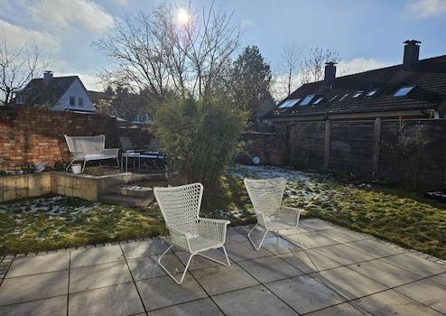 Der Außenbereich umfasst ein Grundstück von ca. 440 m² mit Gartenhaus.