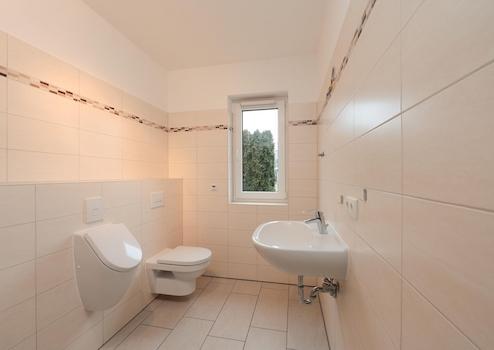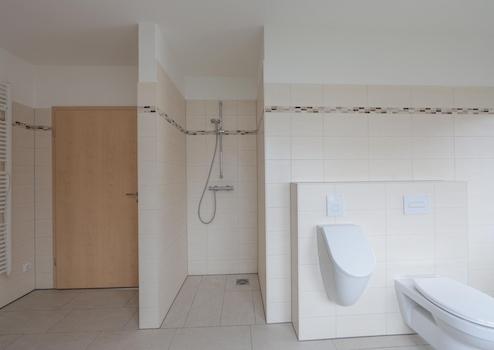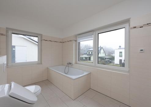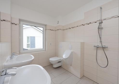 In allen Bädern befinden sich bodengleiche Duschen – und zum Objekt jeweils auch ein Urinal für raschen Ablauf. Das ist besonders nützlich, wenn zwei passende Personen zugleich Eile anmelden, etwa frühmorgens oder nach einer Fernsehsendung oder nach der Rückkehr von außerhalb. Auch darin zeigt sich die besondere Exklusivität des Hauses, die es sonst nirgends gibt. Im OG enthalten beide Bäder doppelte Waschtische und je einen Handtuchwärmer. Die Badewanne im en-suite ans Elternschlafzimmer angeschlossenen Masterbad mißt 180 x 80 cm.
